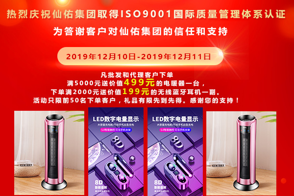 2019年12月10日-2019年12月11日,凡批發(fā)和代理客戶下單,滿5000元送價值499元的電暖氣一臺,下單滿2000元送價值199元的無線藍(lán)牙耳機(jī)一副。活動只限前50名下單客戶,禮品有限先到先得,感謝您的支持!